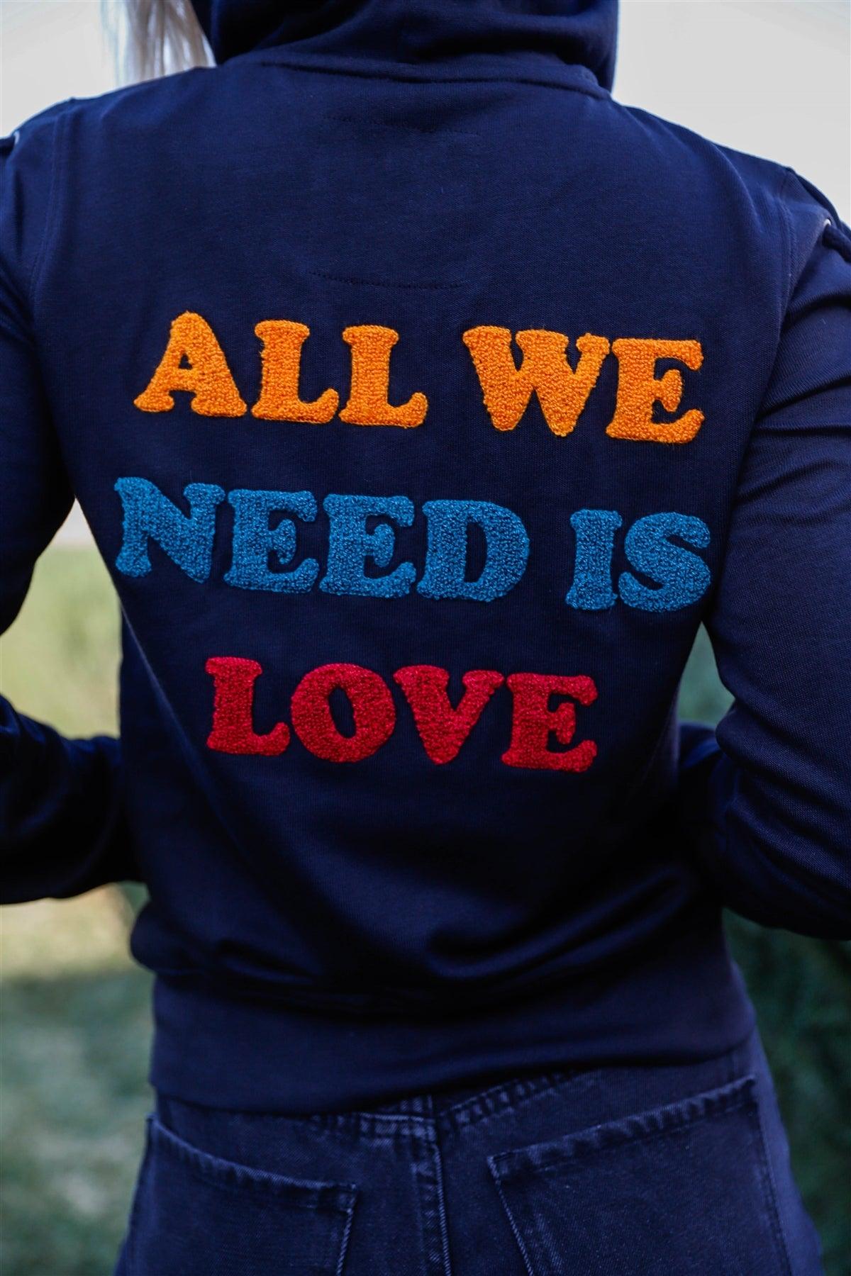 Spread love and style with our "All We Need Is Love" Hooded Sweatshirt. This slim fit, black zip-up features comfy attached hood, lace-up shoulder detail, and playful kangaroo pockets. The back graphic adds a touch of designer flair. A must-have addition to your street style wardrobe. (Love not included)!