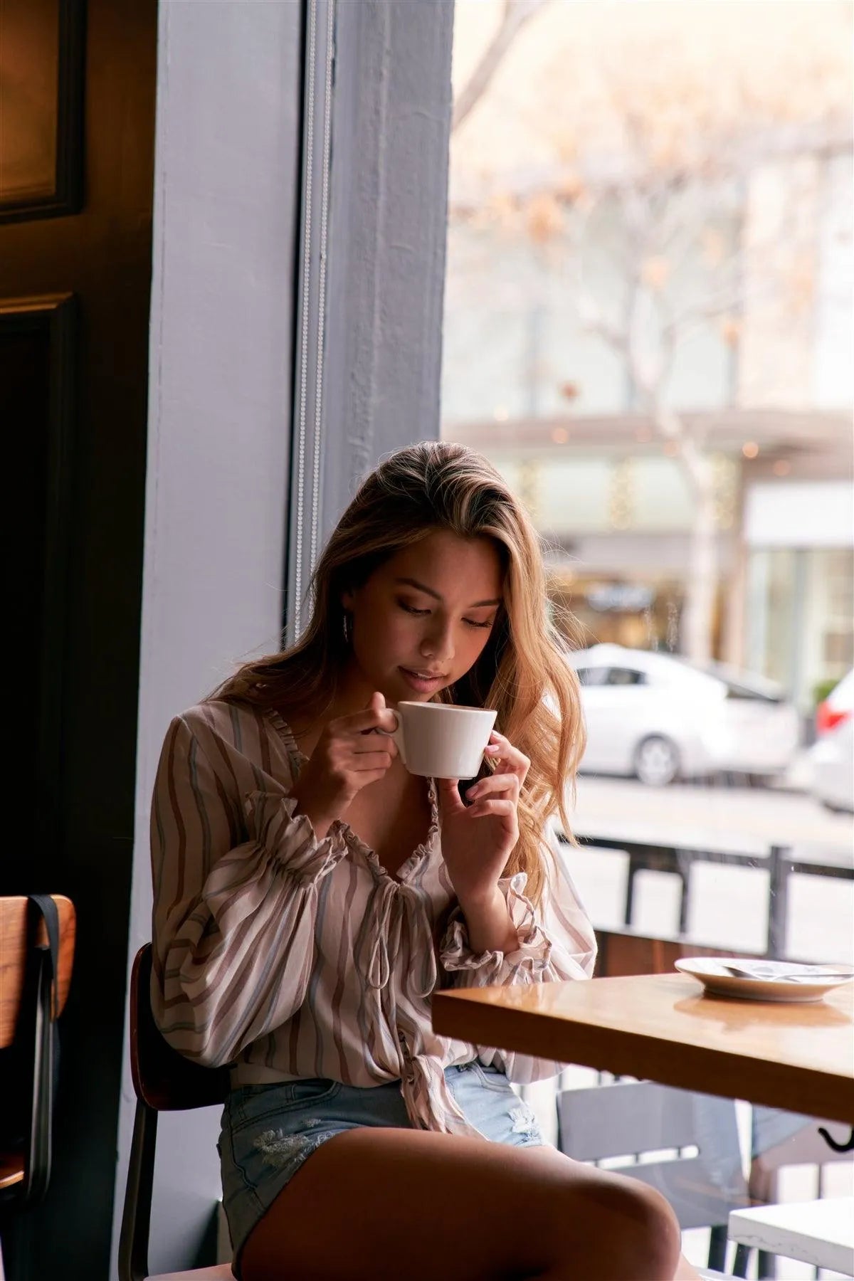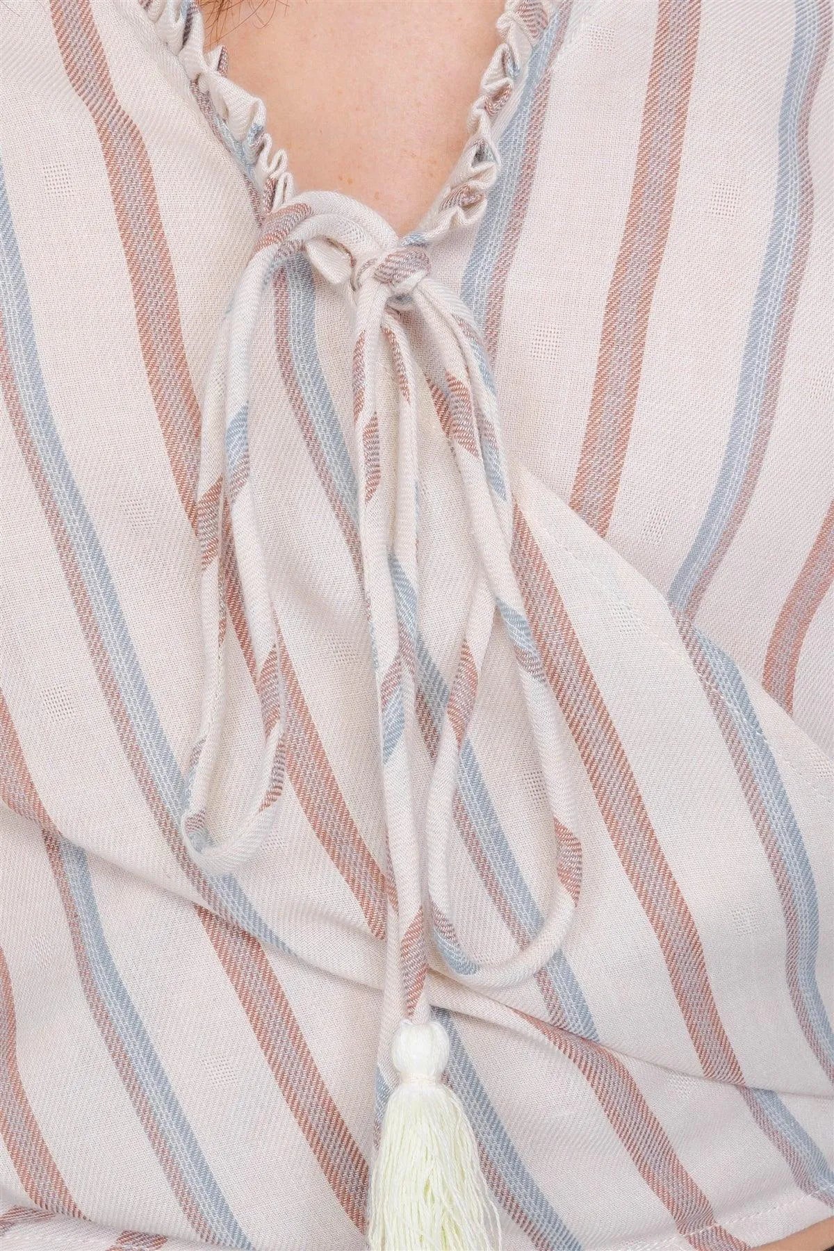 Beige Multi Stripe Boho Front Knot Tassel Puff Sleeve Crop Top /3-2-1