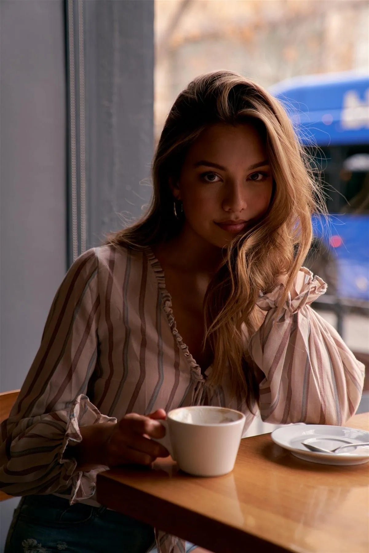Top Features: blue red stripes, boho, chic, vintage, crop length, front knot, front v-neck tie, flounce trim, bust darts, chic, classic, wrap criss cross waist tie, very stretchy, unlined. Model is 5'10" and wearing a Small (Waist 26", Bust 33B", Hips 35")Item Measurements: Length: 17.5 , Bust: 34" , Sleeve: 25.5"True to Size