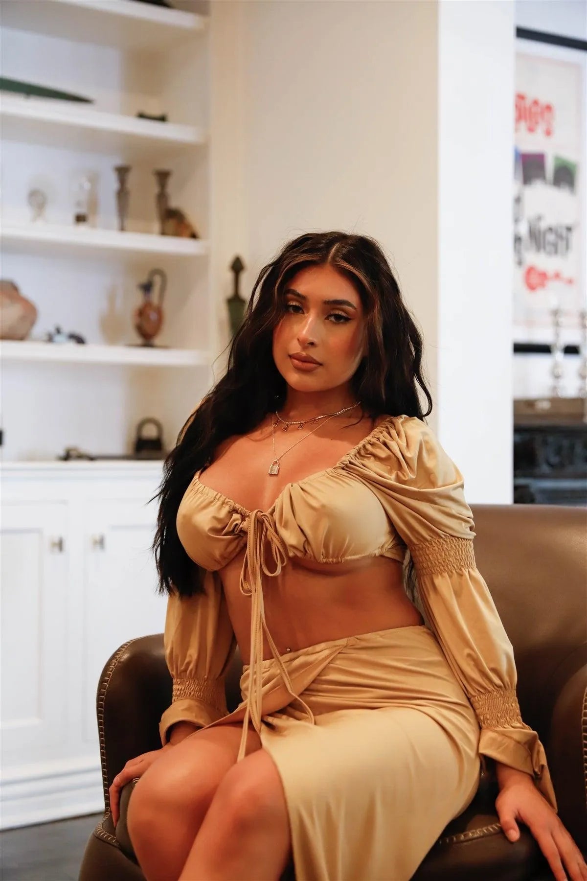 Beige Self-Tie Detail Juliette Sleeve Crop Top & Wrap Midi Skirt Set /2-2-2