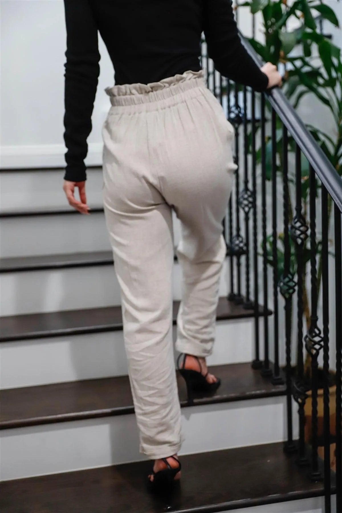 Beige Viscose & Linen Blend Self-Tie Belted Pants /1-2-1
