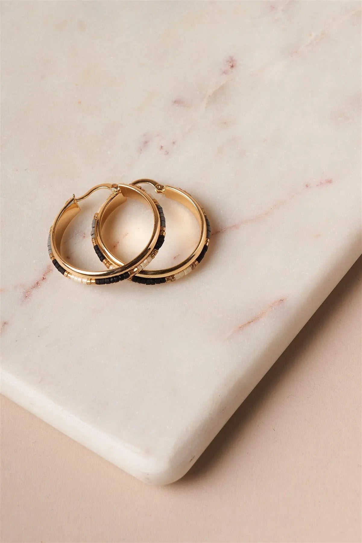 Black And Grey Beaded Accent Gold Hoop Earrings /1 Pair