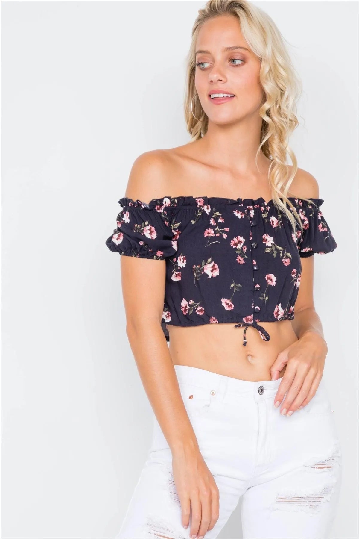 Black Boho Floral Off-The-Shoulder Flounce Trim Crop Top /3-2-1