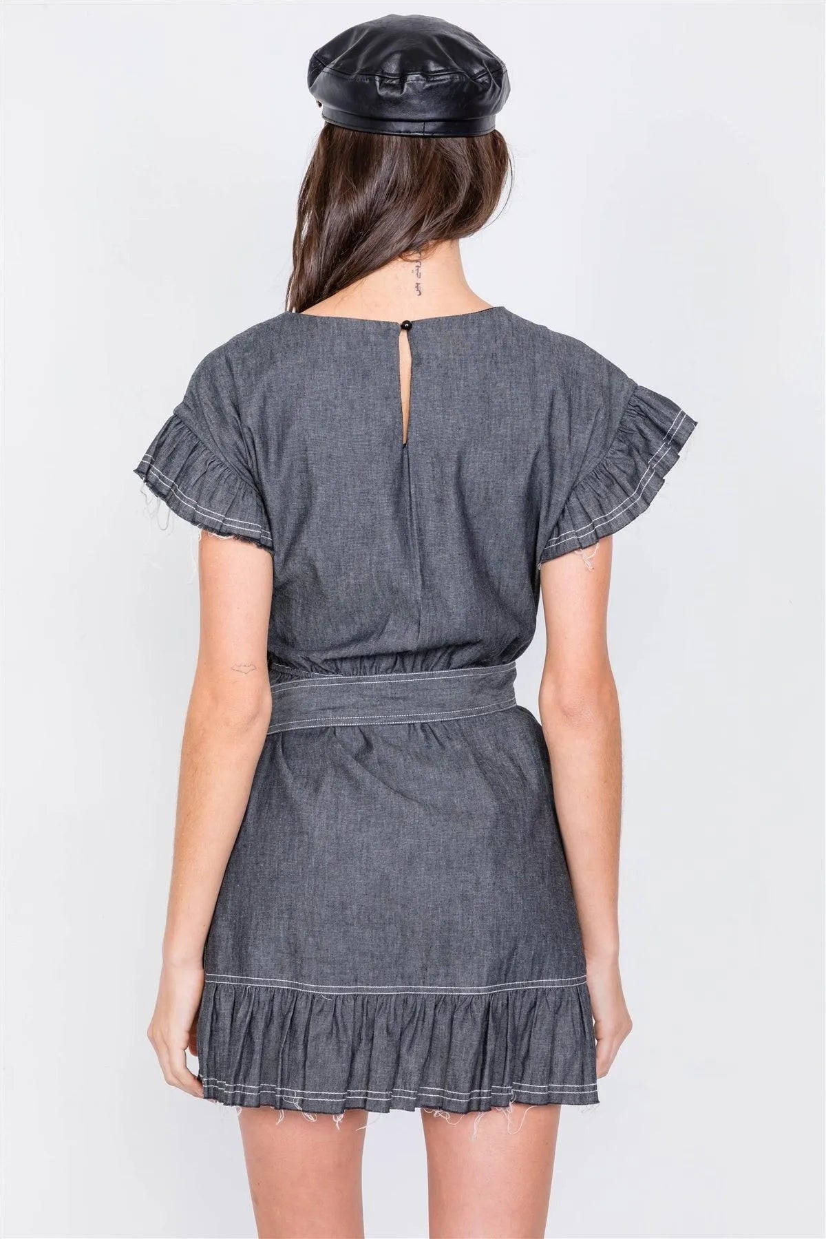 Black Denim Raw Frill Contrast Trim Hem Wrap Casual Mini Dress /3-2-1
