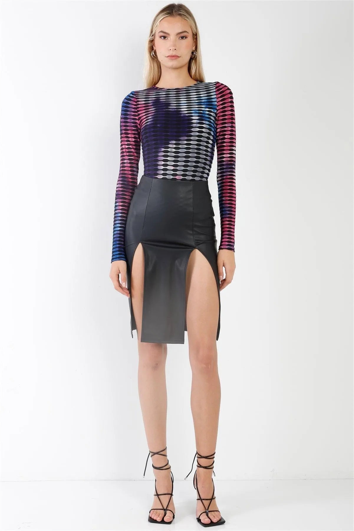 Black Faux Leather High Waist Slit Details Midi Skirt /1-1-2