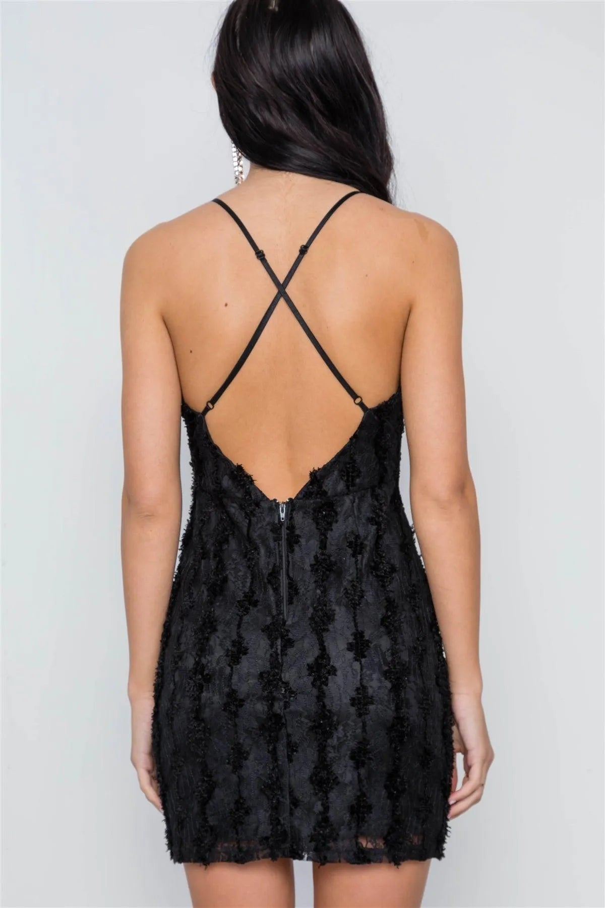 Dress features: adjustable cami straps, V-Neckline with v-wire, open back with cross straps, fluffy detailing allover, back zip closure, bodycon, mini length, linedModel is 5'8 and wearing Small (Waist: 24", Bust: 32A, Hips: 34")Item Measurements: Length: 32", Bust: 32"True to size