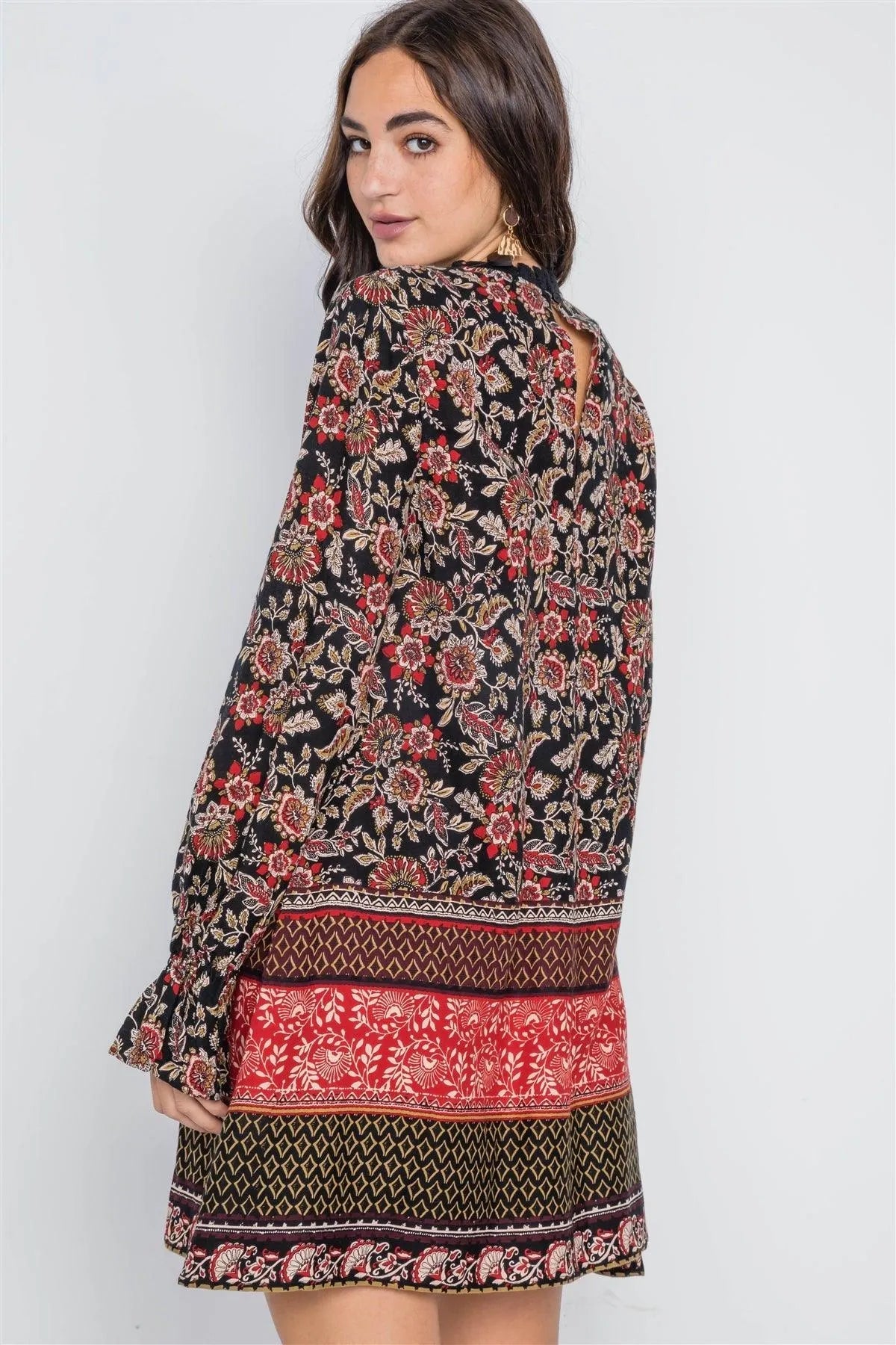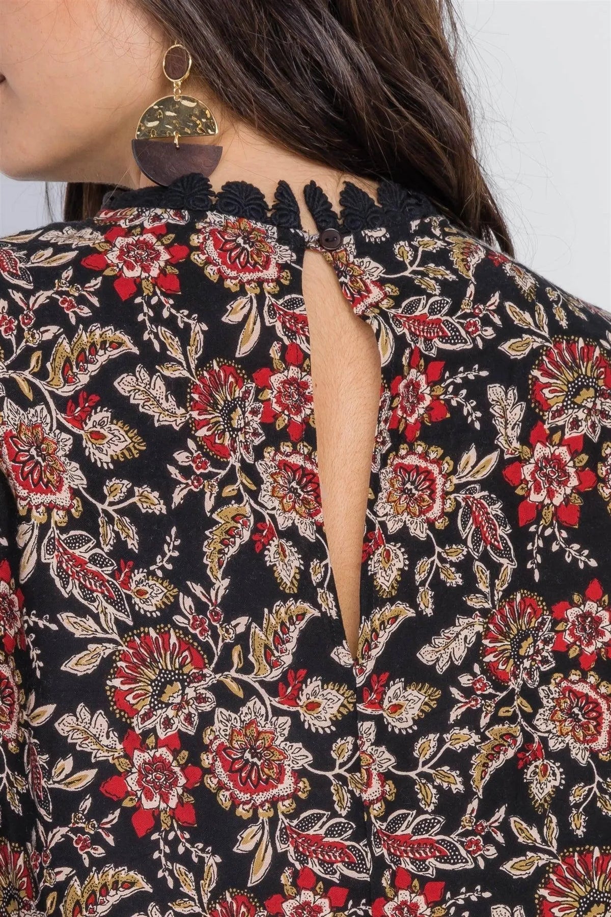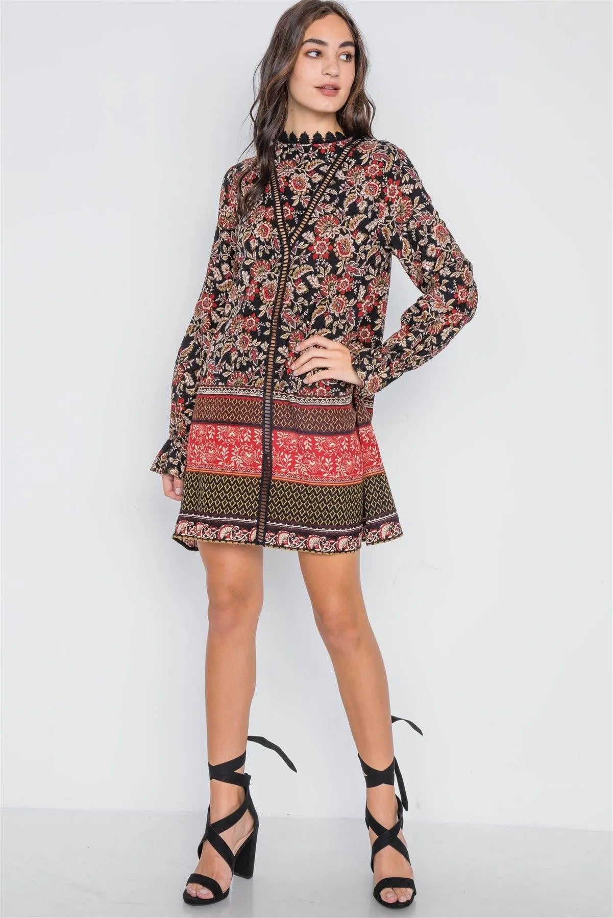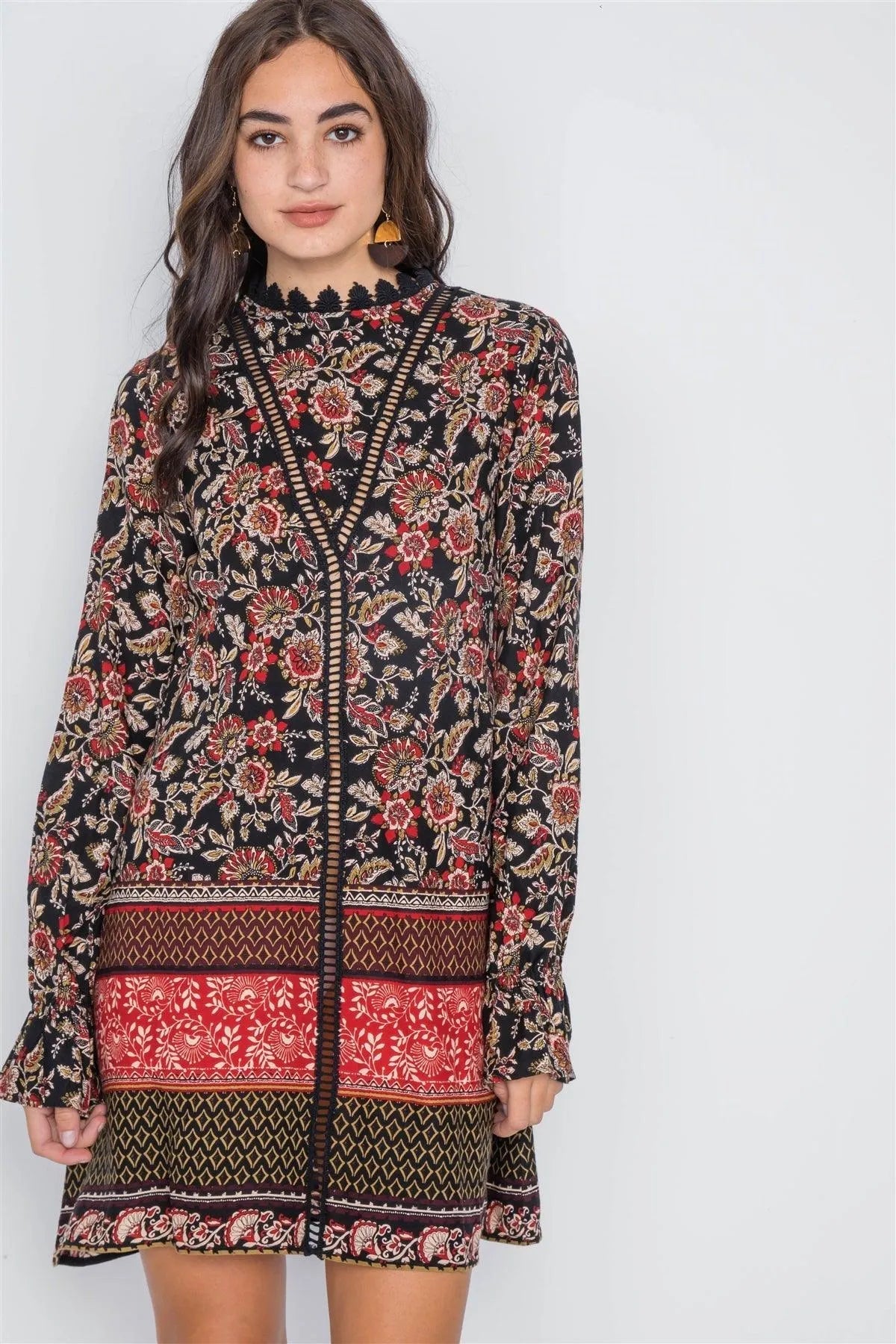 Black Floral Print Crochet Trim Mini Dress /2-2-2