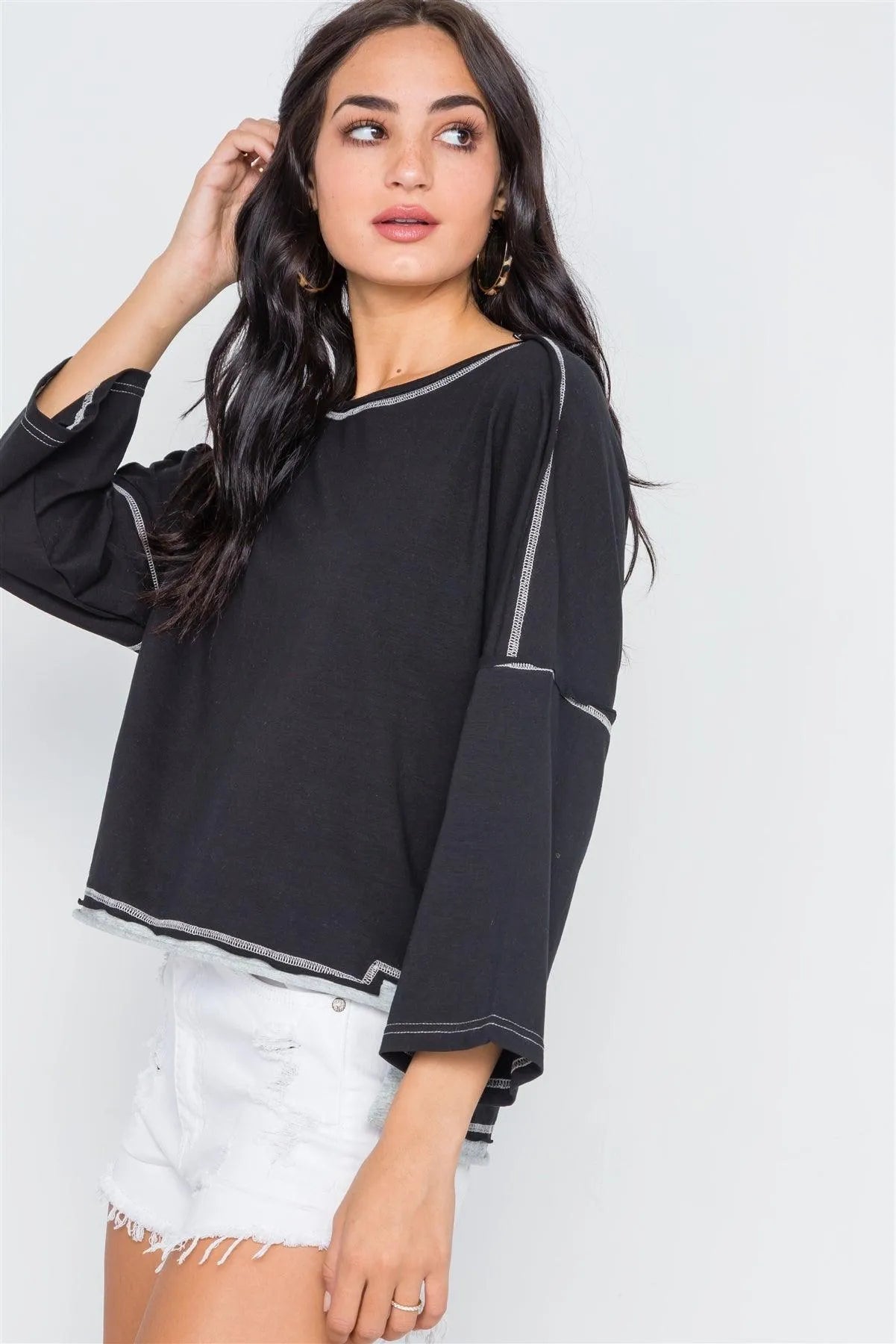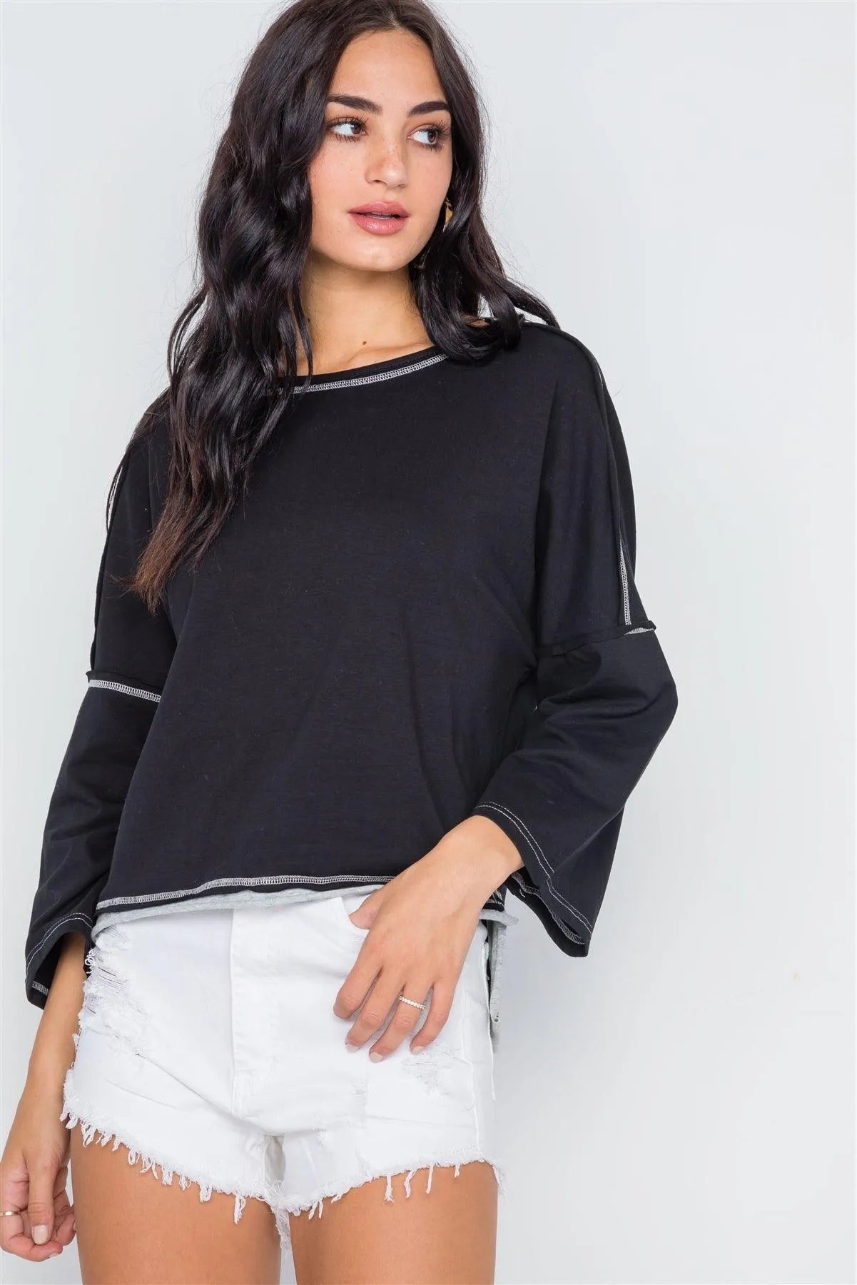 Black Grey Raw-Cut Loose Fit Tee Top /2-2-2