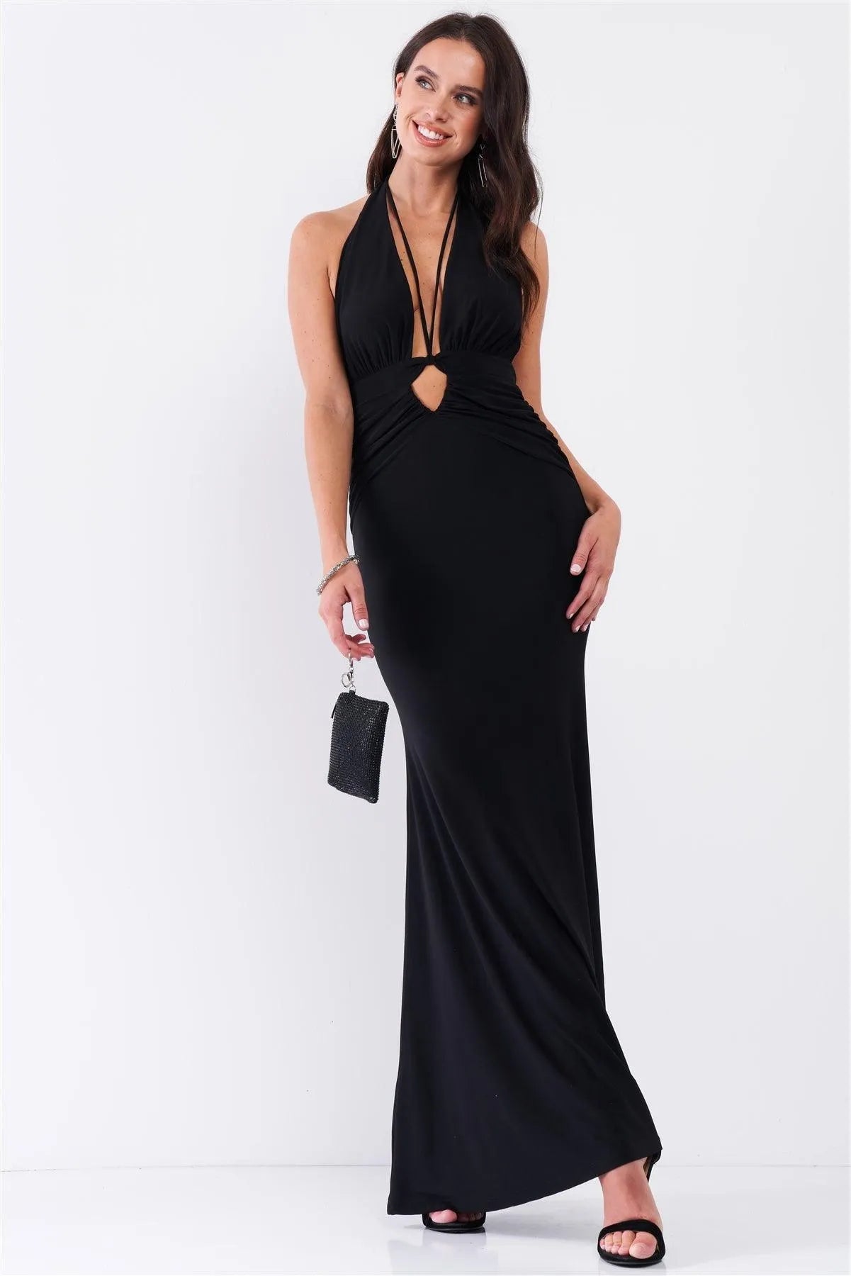 🖤 Item Features: Solid black, sleeveless, front cut out detail, halter neck, ruched, nape self-tie strap, open back, mermaid cut, maxi length, lined, stretchy, hot, sexy, club wear, night out, party look