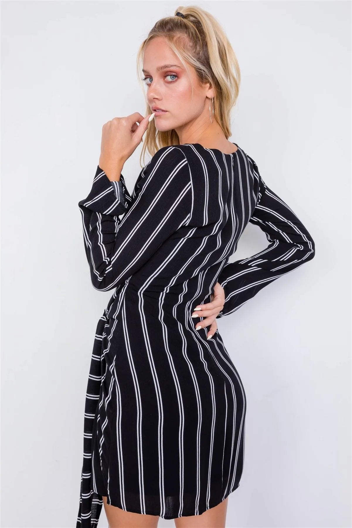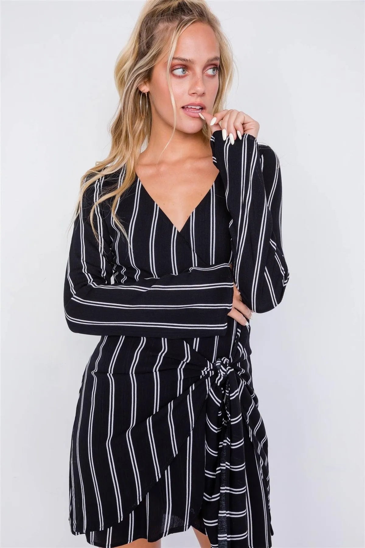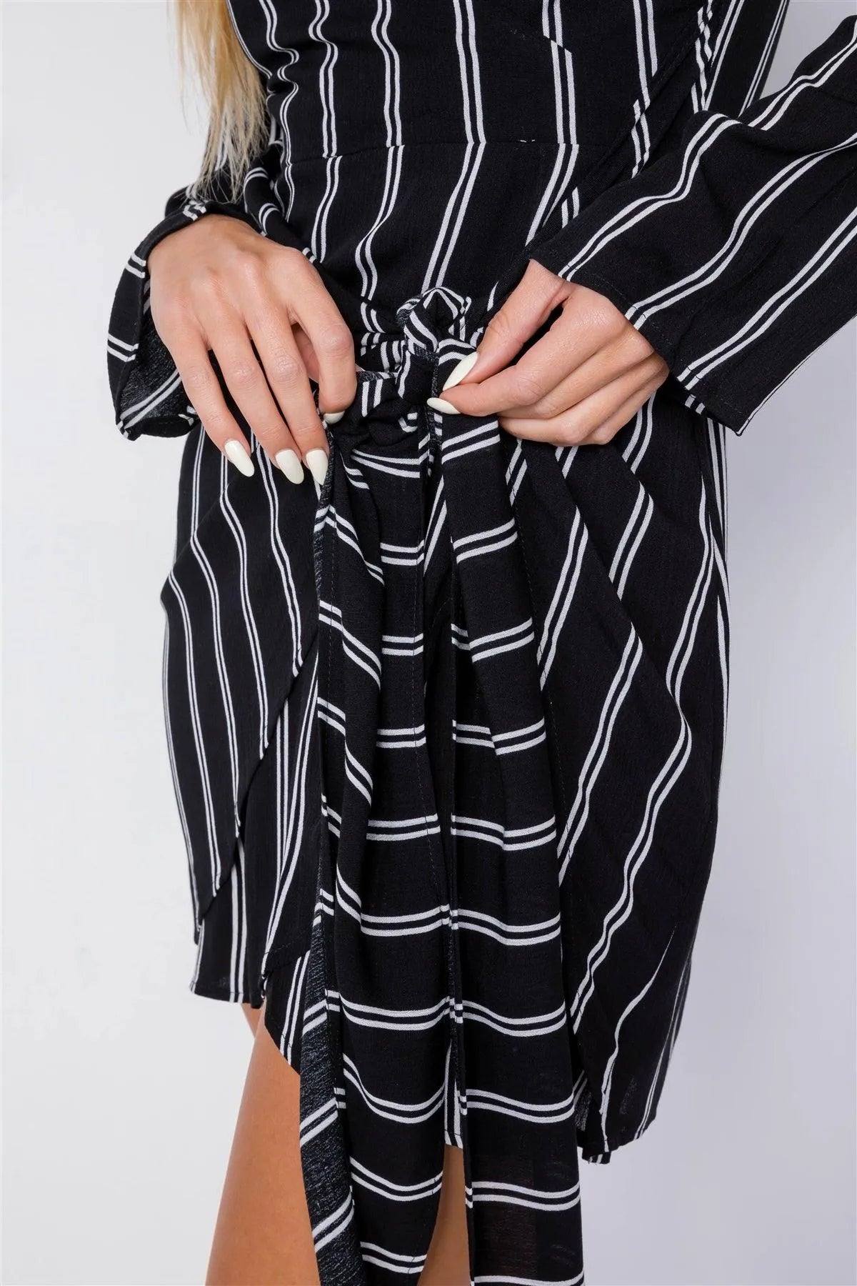 Black Ivory Stripe Mock Wrap Office Chic Mini Dress /3-2-1