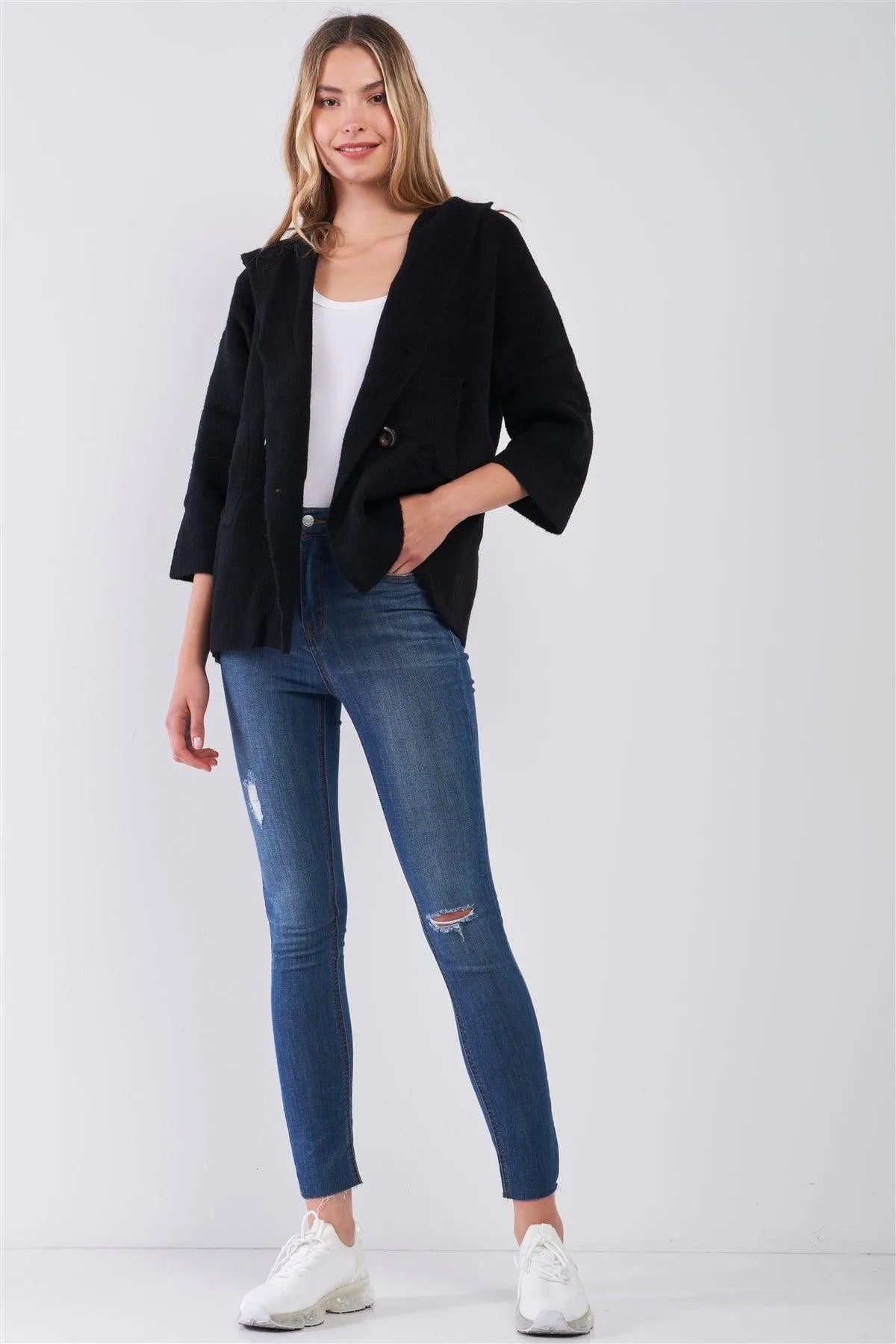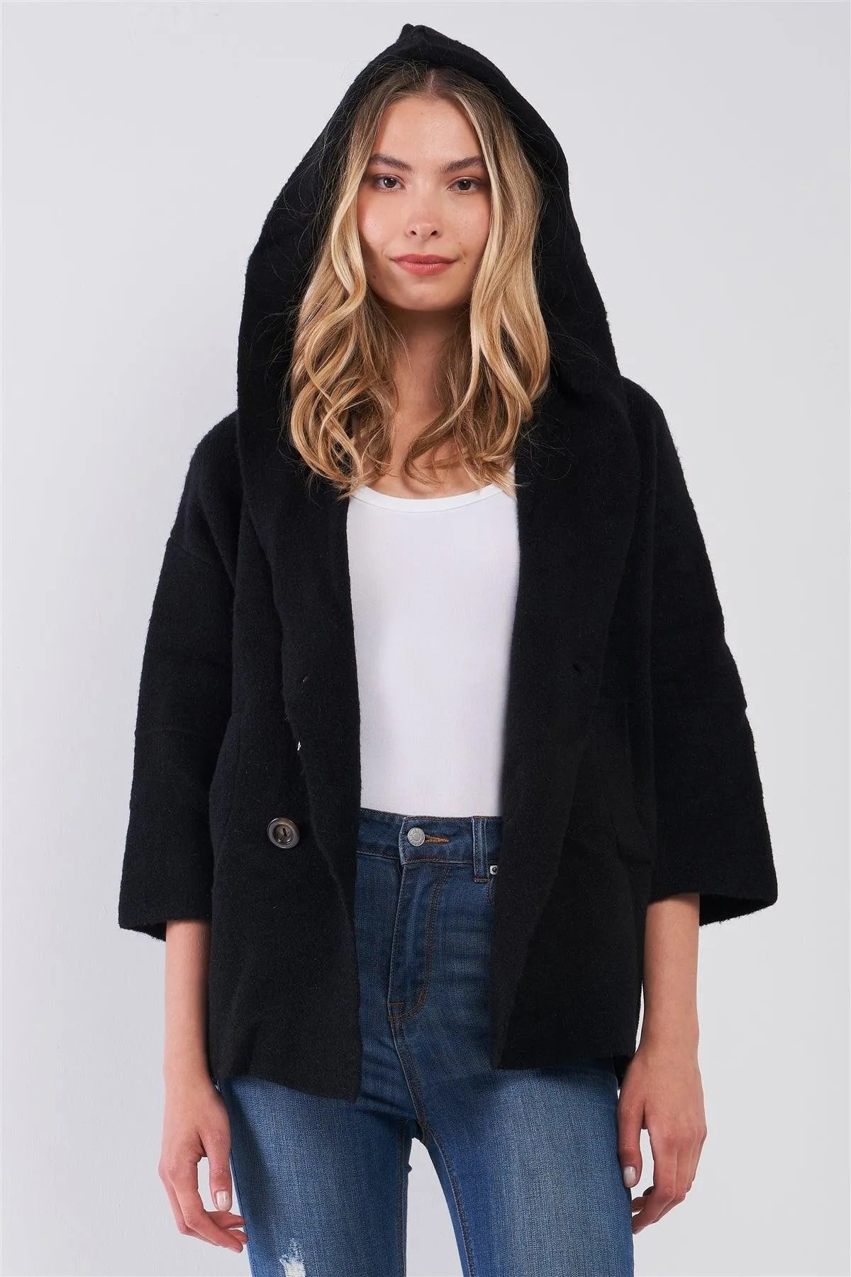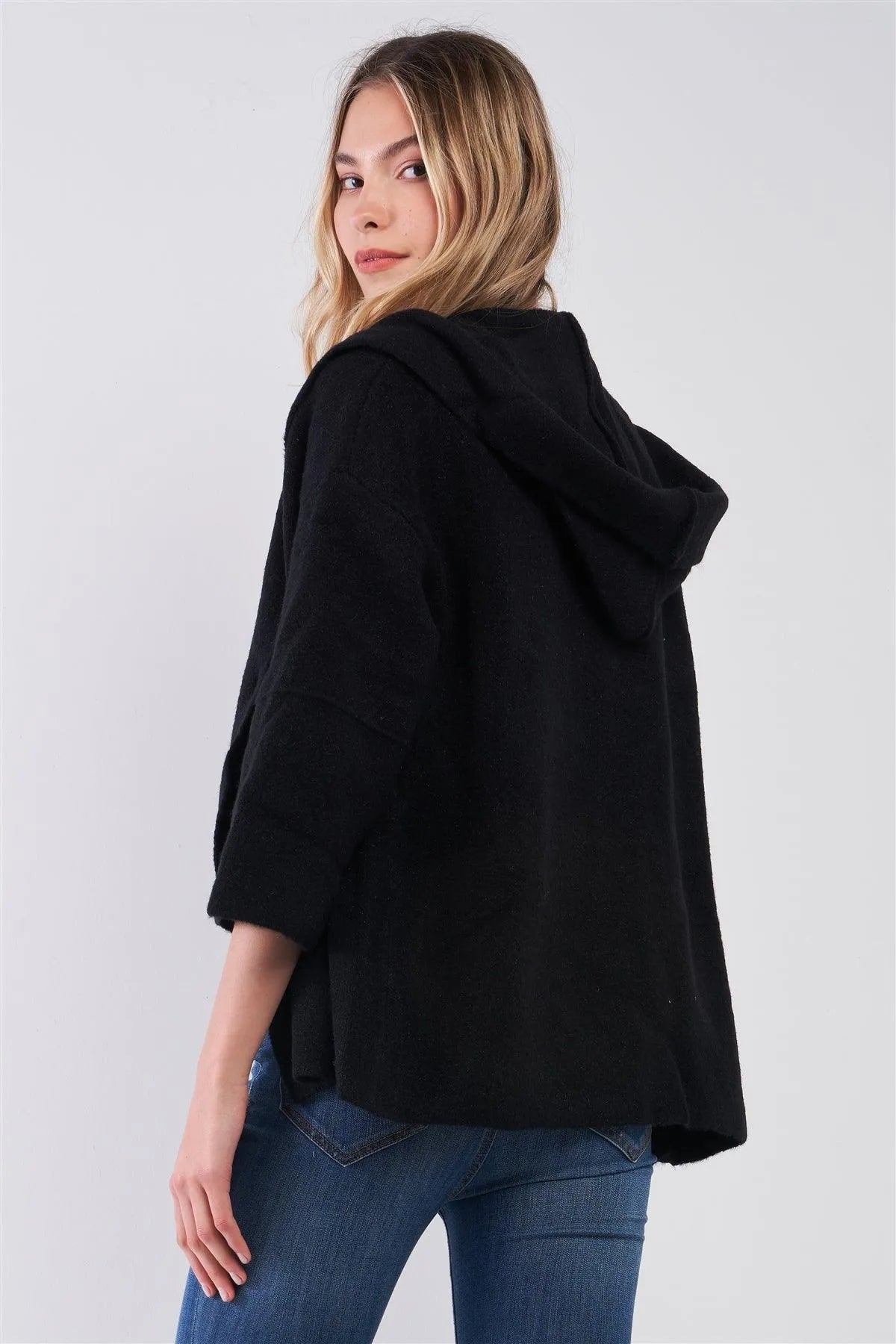 Black Knit Buttoned Front 3/4 Sleeve Hooded Cardigan