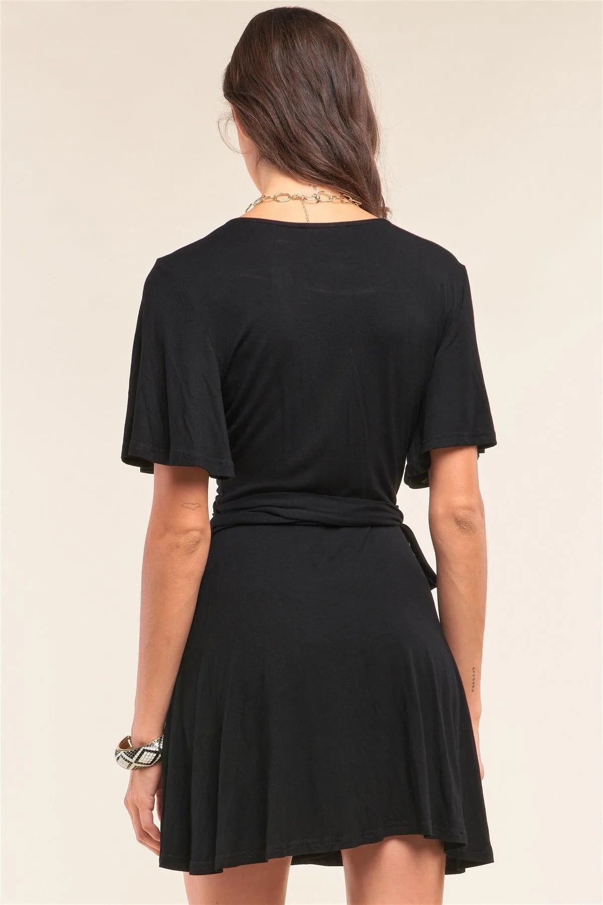 Black Deep Plunge V-Neck Self-Tie Wrap Flare Sleeve Mini Dress /1-2-2-1