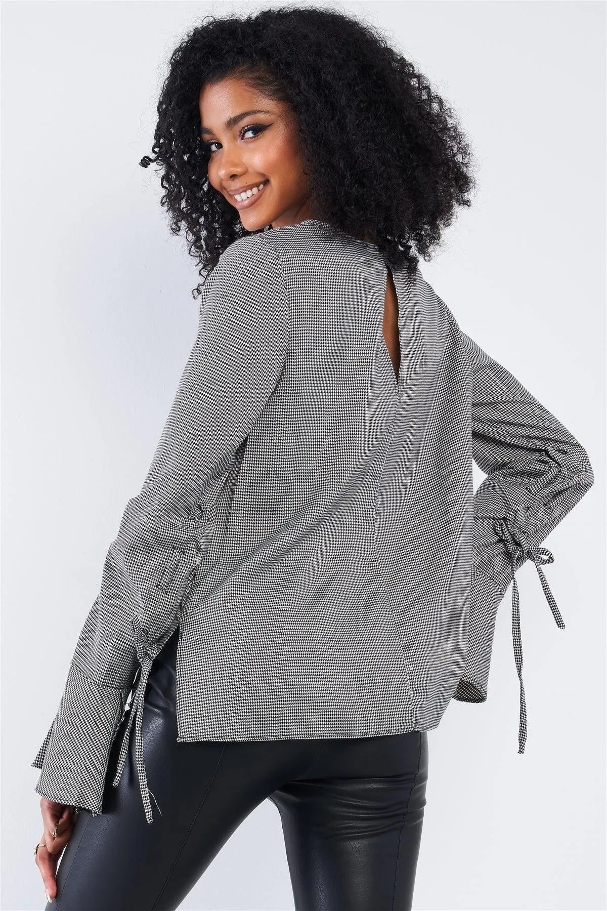 Black & White Mini Houndstooth Print Floral Embroidered Long Flutter Hem Sleeve Blouse Top /1-2-2-1