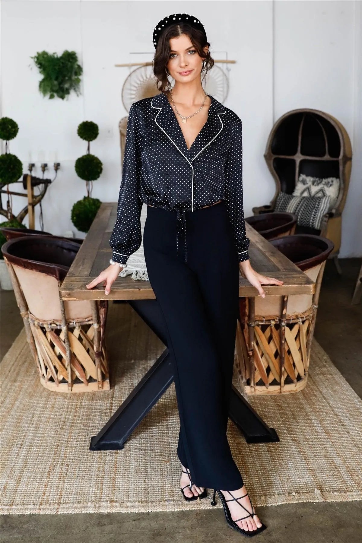 Black & White Polka Dot Contrast Trim Notch Collar Lace Tie Hem Top /1-2-2-1