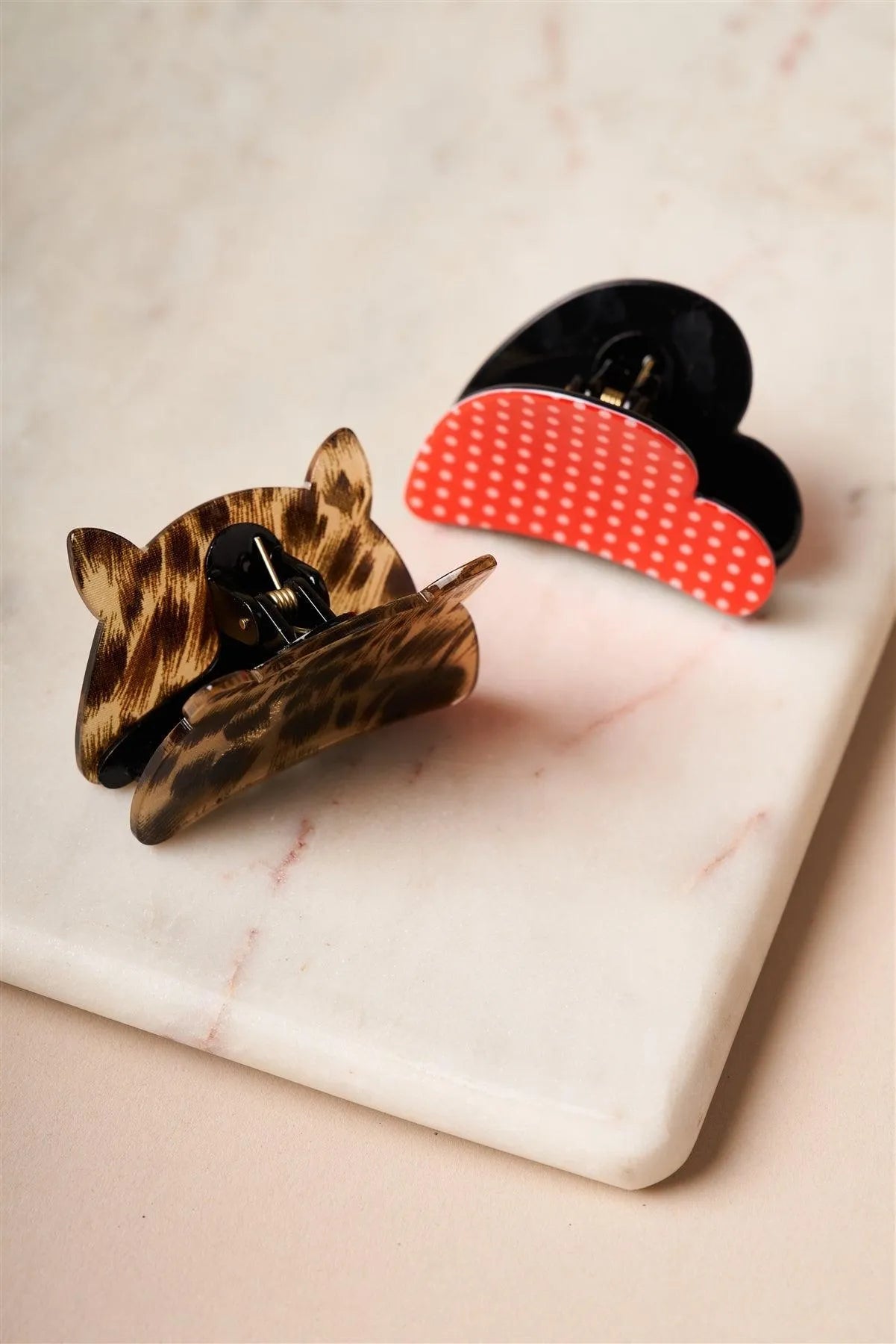 🖤 Cheetah print cat-shaped clip and polka dot heart shaped clip
