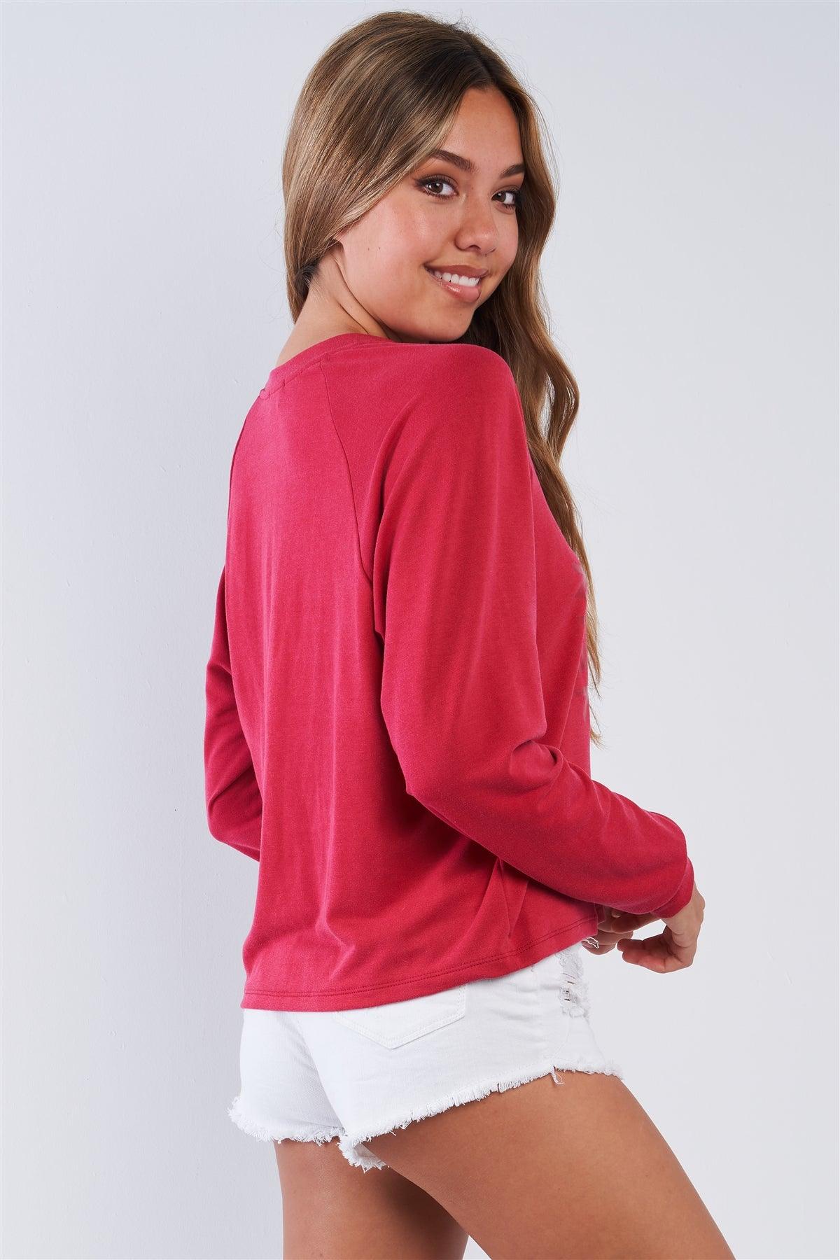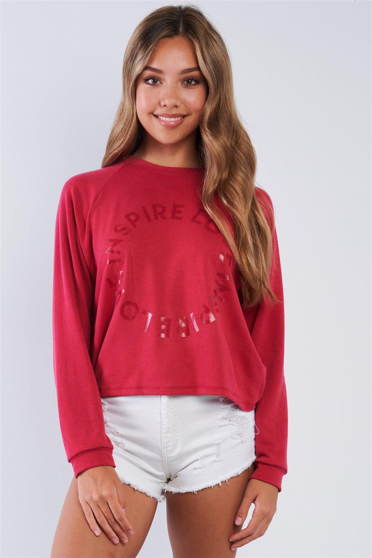 Women sweater: Red, solid, long sleeve, graphic writing, "inspire love", crew neck, fleece, loose fit