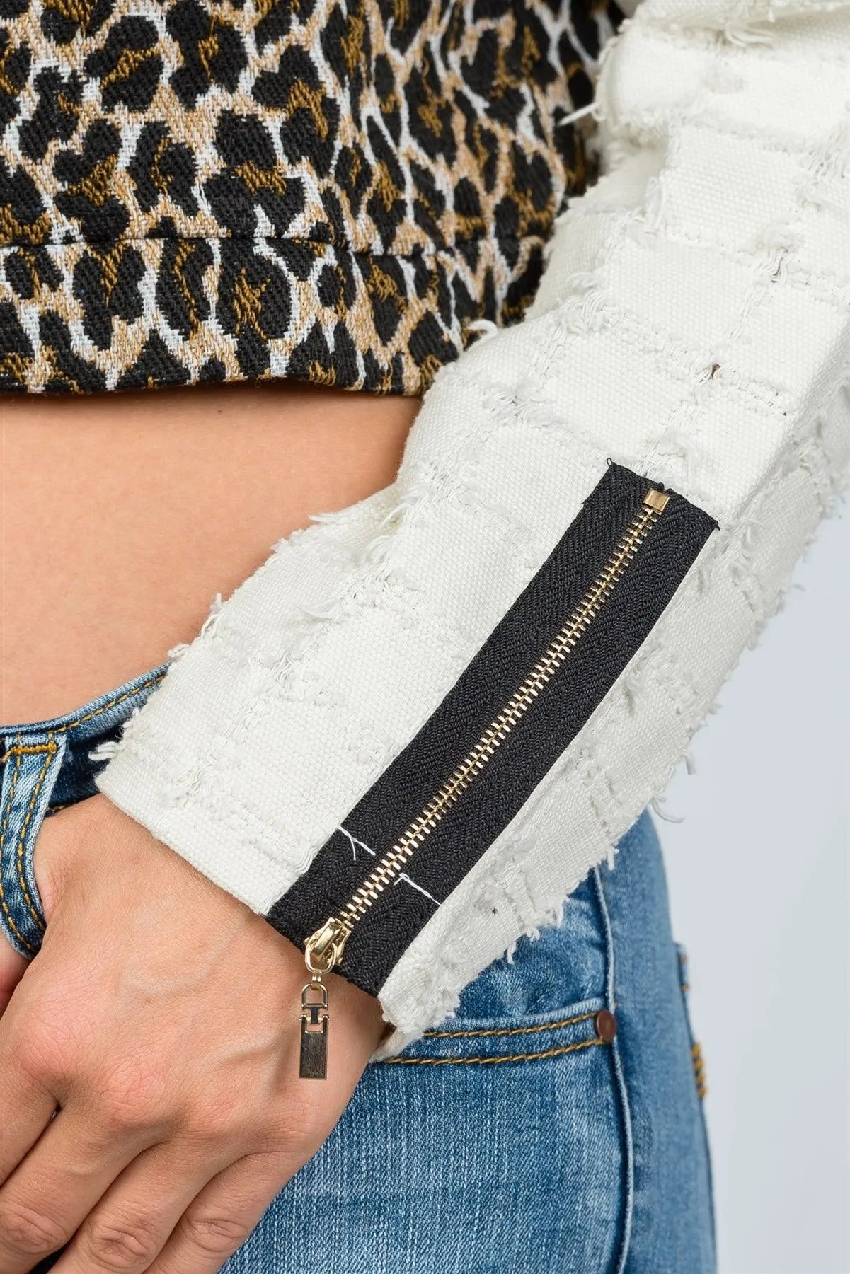 Top features: Round neckline, contrast sleeves, dropped shoulder, long sleeves with zipper detail, animal print allover, back zipper closure, relaxed fit.Model is 5'8" and wearing a Small (Waist 23", Bust 33B", Hips 35")Item measurements Top: Length: 19'', Bust: 38", Sleeve Length: 22"