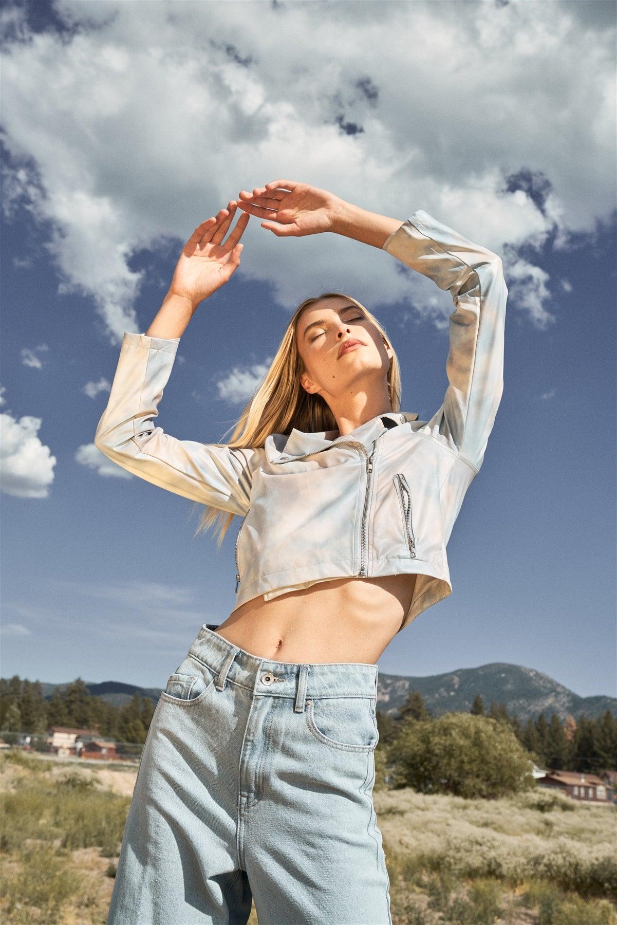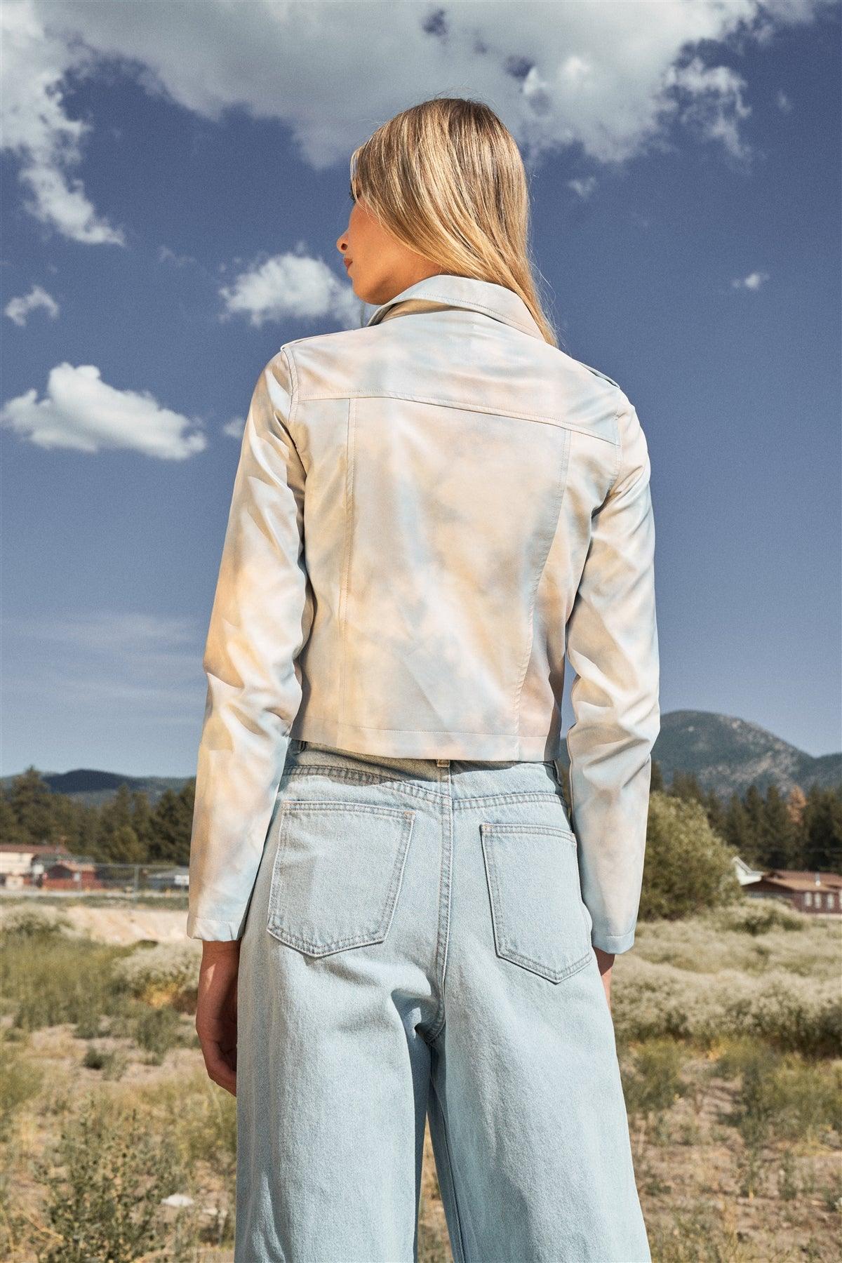 "Vanilla Sky" Light-Blue Vegan Leather Tie-Dye Print Long Sleeve Classic Bicker Jacket /3-2-1
