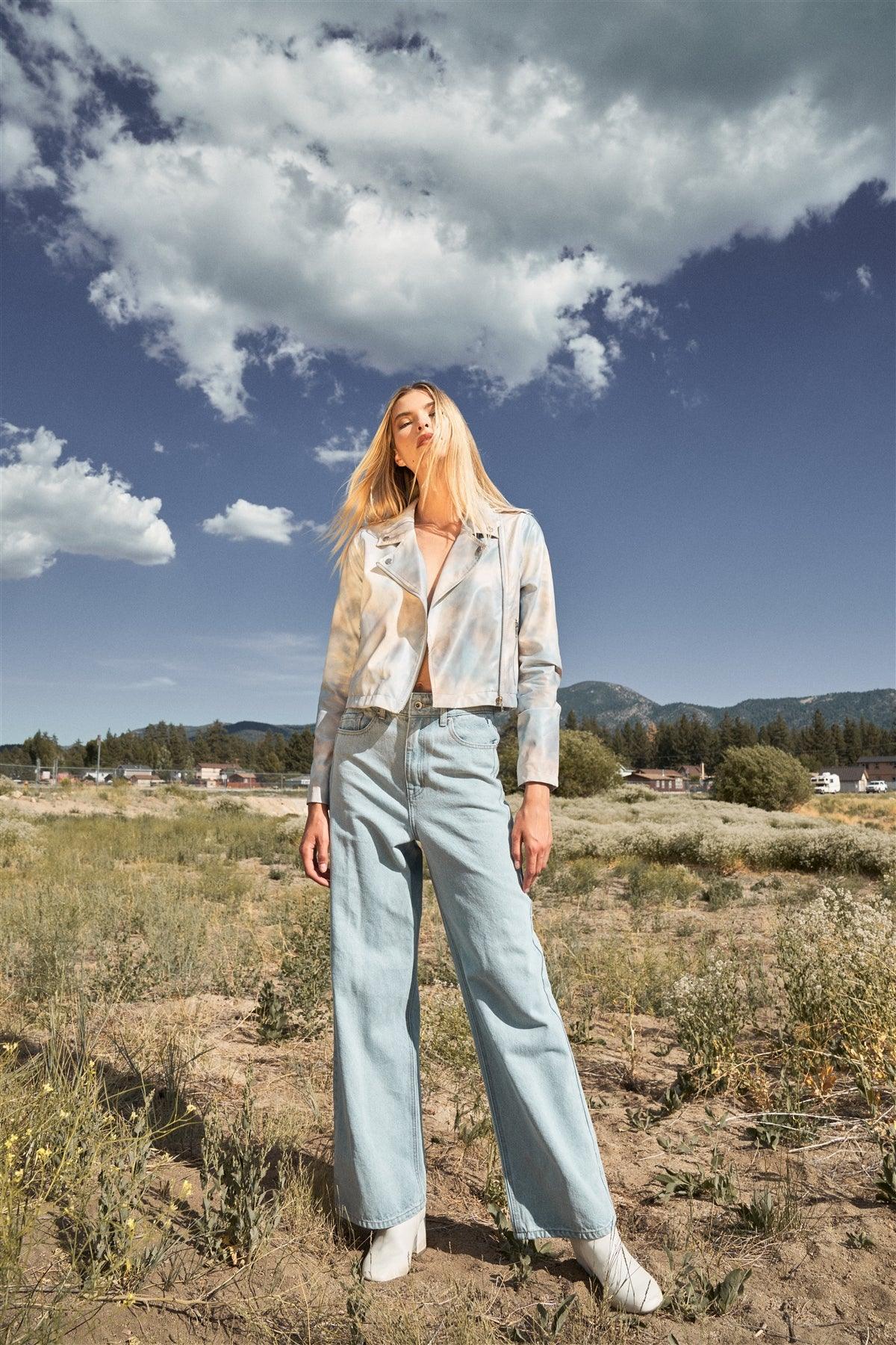 🖤Item Features: Light-blue, tie-dye "cloud" print, long sleeve, vegan leather, asymmetric zip fastening, notch collar, regular fit, two side zipper pockets, fully lined, notch lapels, press-stud collar, shoulder epaulettes, cute print, hot trend, casual, stylish