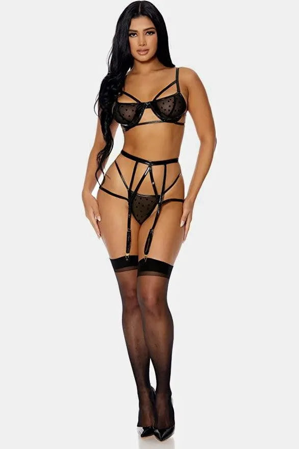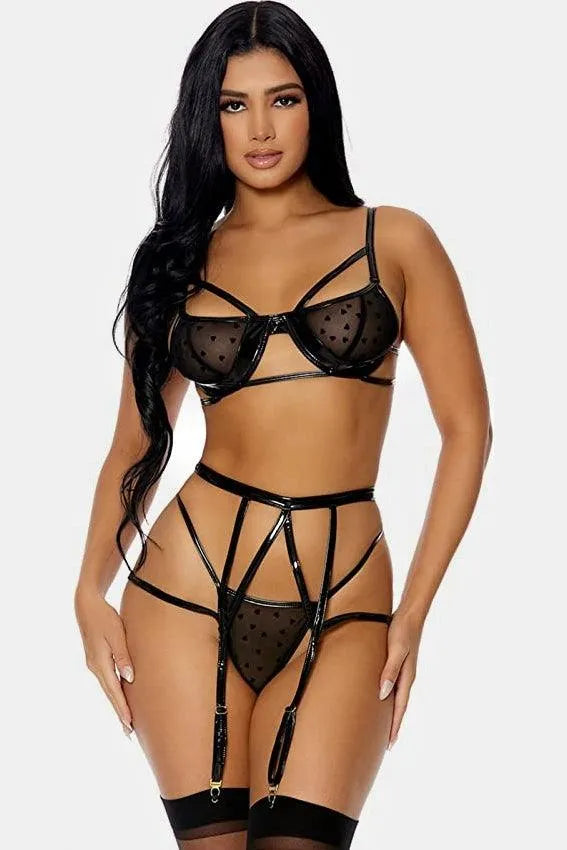 Black Heart Mesh Vinyl Three Piece Set Lingerie
